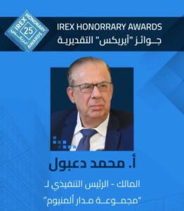 الملتقى يقدم جائزة آيريكس التقديرية للأستاذ محمد دعبول بصفته المالك والمدير التنفيذي لمجموعة “مدار ألمنيوم” تقديراً لريادته وجهوده الخلّاقة لأكثر من نصف قرن في مجال تطوير أنظمة الألمنيوم.